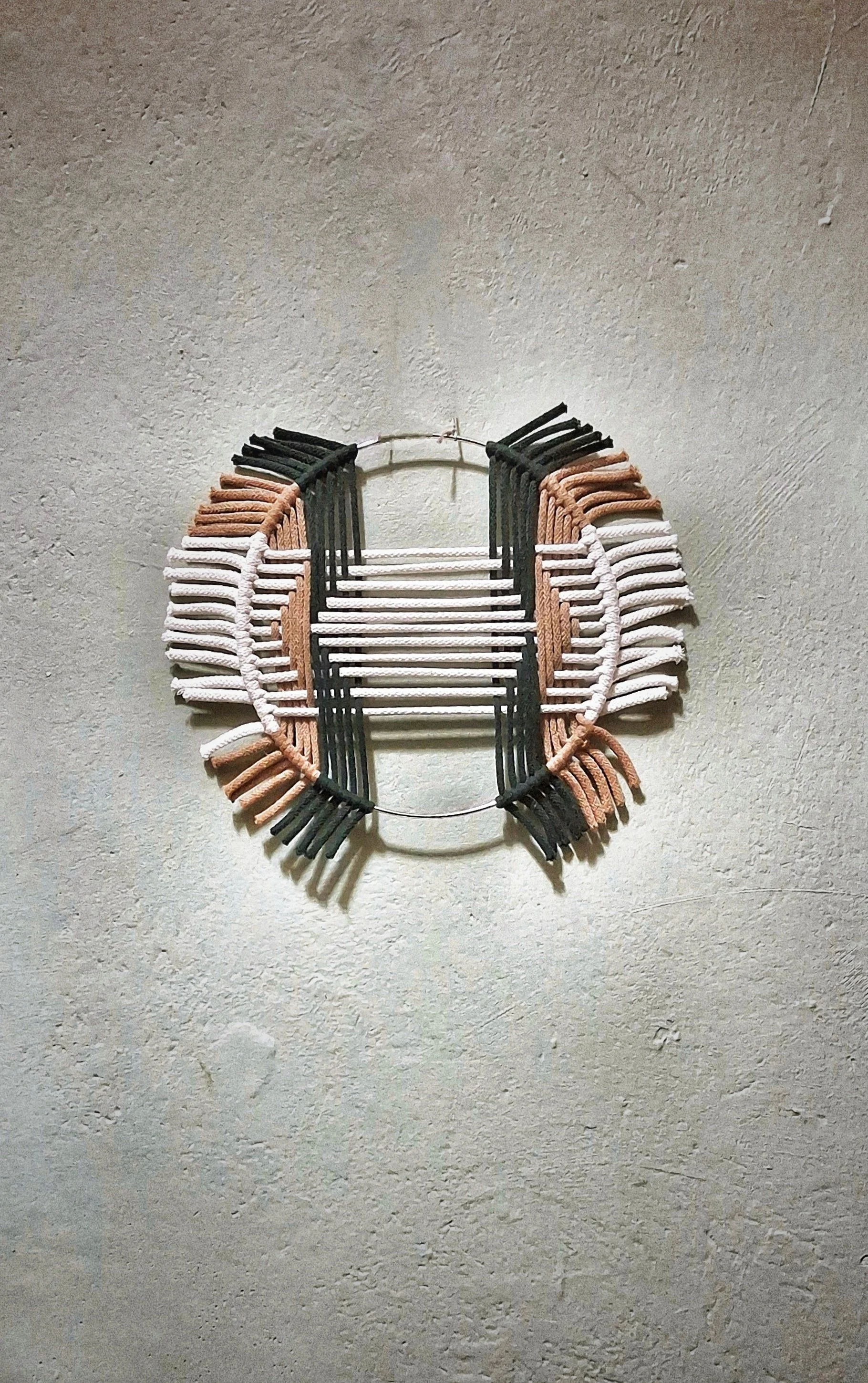 A modern, nature-inspired wall hanging handwoven onto a metal ring using soft cotton cord in earthy green, brown, and white tones. The geometric pattern brings a sense of balance and calm, while the intentionally short ends give it a clean, contemporary finish.